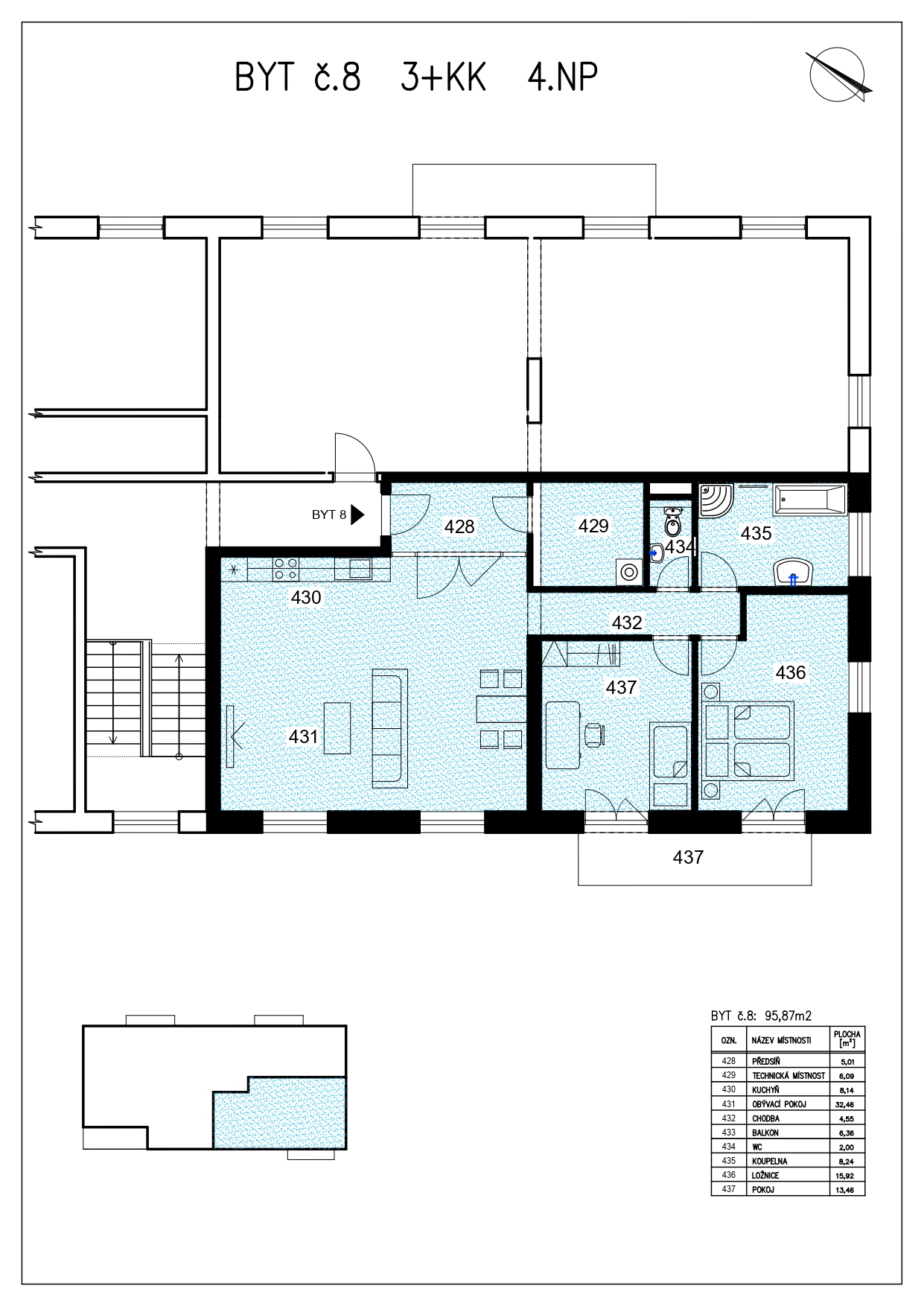 Následuje plánek bytu, který ukazuje inteligentní dispozici jednotlivých místností. Uvidíte, jak je byt efektivně uspořádán, aby poskytoval maximální pohodlí a prostor pro život. Věříme, že si tento prostor zamilujete, a navštívíte nás co nejdříve.